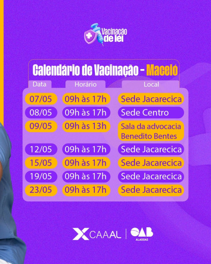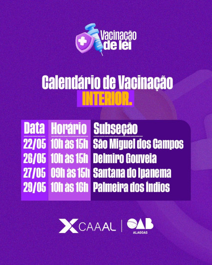 Nos municípios do interior, a vacinação começa no dia 13 de maio, na sede da OAB/AL em Arapiraca, de 10h às 17h; no dia 14, a equipe de imunização segue para a sede do Vale do Paraíba - Atalaia, de 10h às 15h, e no dia 16 de maio, as vacinas serão aplicadas em Porto Calvo, de 10h às 15h.