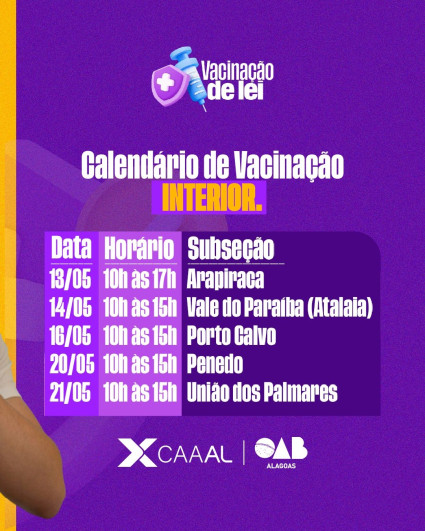 Nos municípios do interior, a vacinação começa no dia 13 de maio, na sede da OAB/AL em Arapiraca, de 10h às 17h; no dia 14, a equipe de imunização segue para a sede do Vale do Paraíba - Atalaia, de 10h às 15h, e no dia 16 de maio, as vacinas serão aplicadas em Porto Calvo, de 10h às 15h.